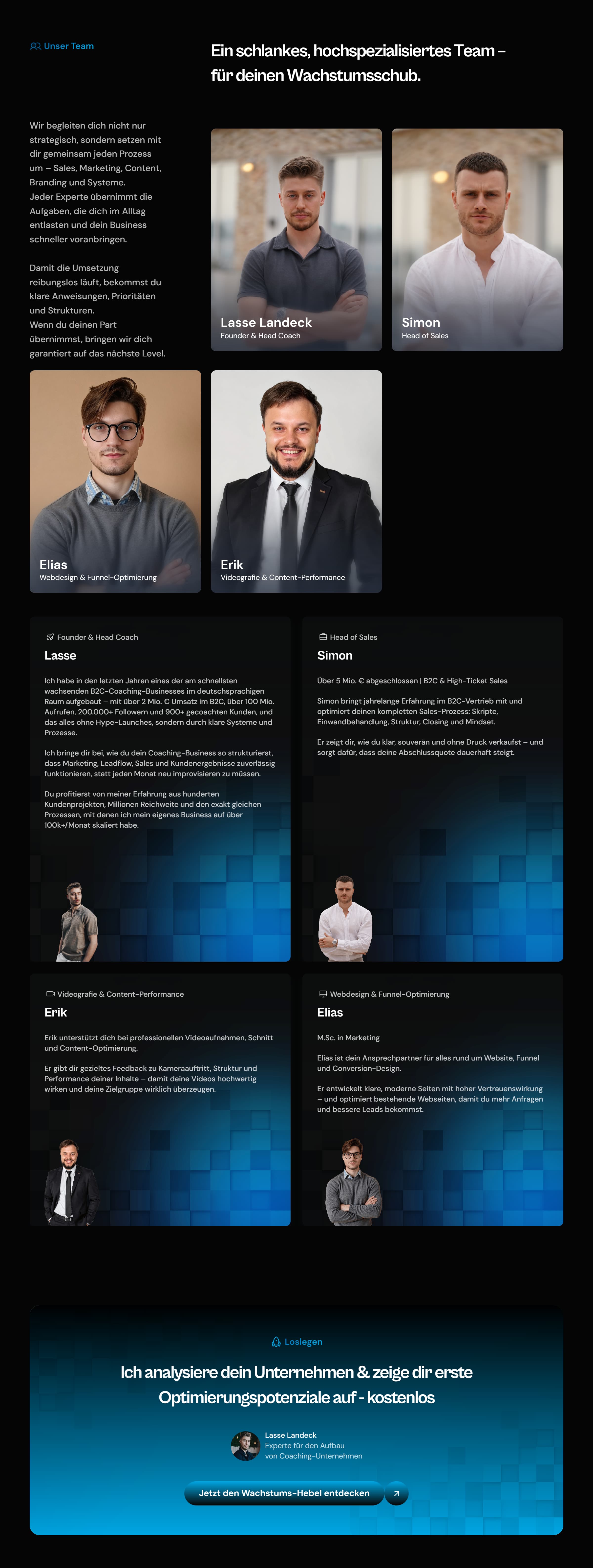 Deine Website sollte vor allem in Richtung Conversion-Optimierung ausgerichtet sein. Zumindest ist das mein erster Eindruck. Wenn das Hauptziel deiner Website ist, so viele Anfragen wie möglich zu generieren, dann sollte die gesamte Website-Struktur darauf ausgelegt sein. Hilfreich sind bestimmte Sektionen, die Social Proof vermitteln – zum Beispiel eine Team-Sektion. Diese kommuniziert nicht nur, dass ein Team hinter dem Unternehmen steht, sondern signalisiert indirekt auch eine gewisse Marktetablierung: Ein Team von einer gewissen Größe würde sich sonst wirtschaftlich nicht lohnen.
